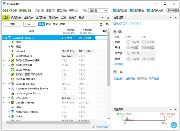 1、提供直观的用户界面和实时流量图表,清晰显示每个应用程序或进程的上传和下载速度。2、支持按应用程序名称、进程ID、域名、IP地址范围等条件设置带宽限制,灵活分配网络资源。